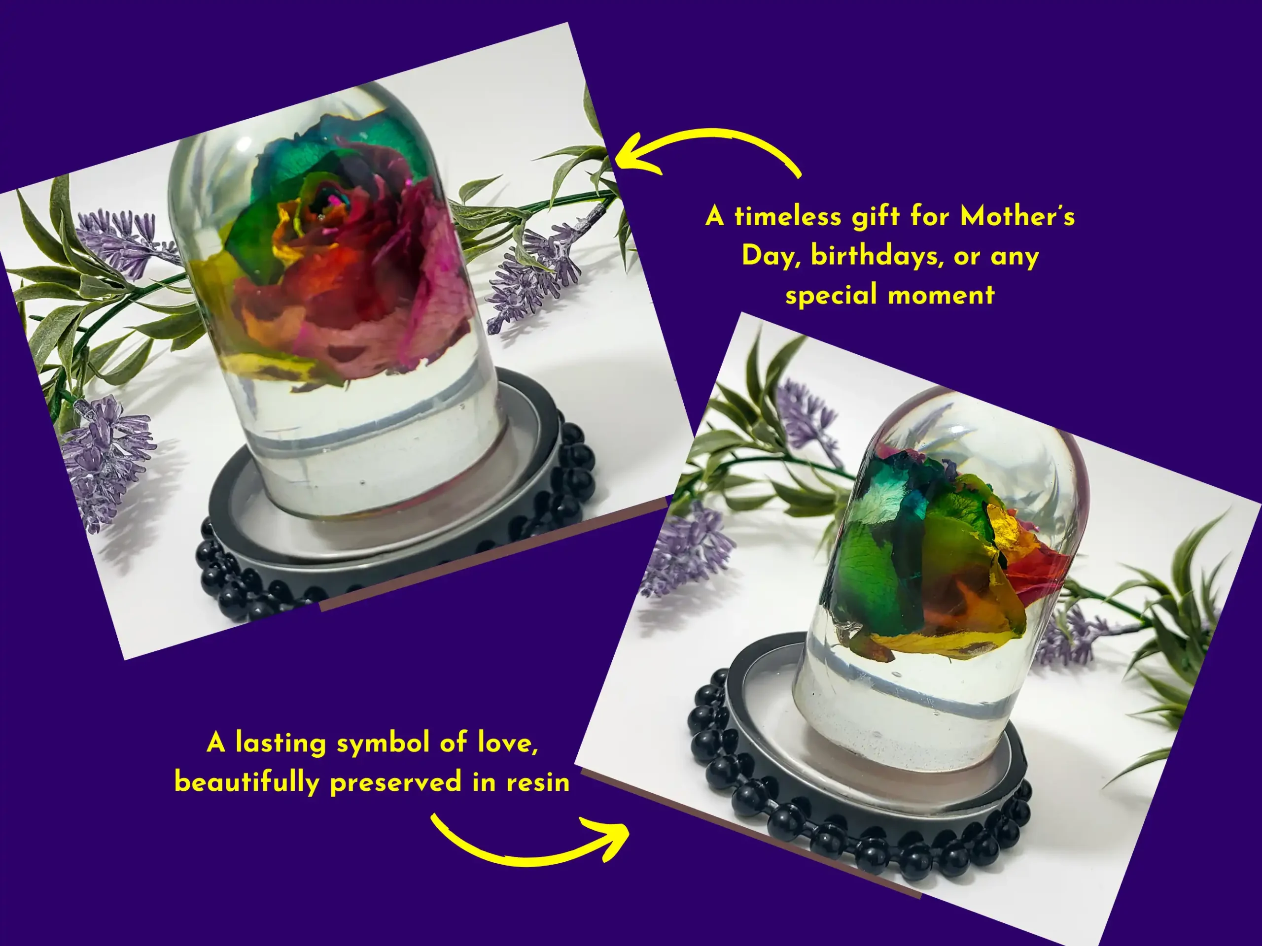 This Encased Rose is exactly what it sounds like: a rose bloom sealed inside a clear resin dome, like a little moment frozen in time. The colours are bold and vibrant, so it’s got that “stops-you-mid-scroll” effect on a shelf, desk, or bedside table.