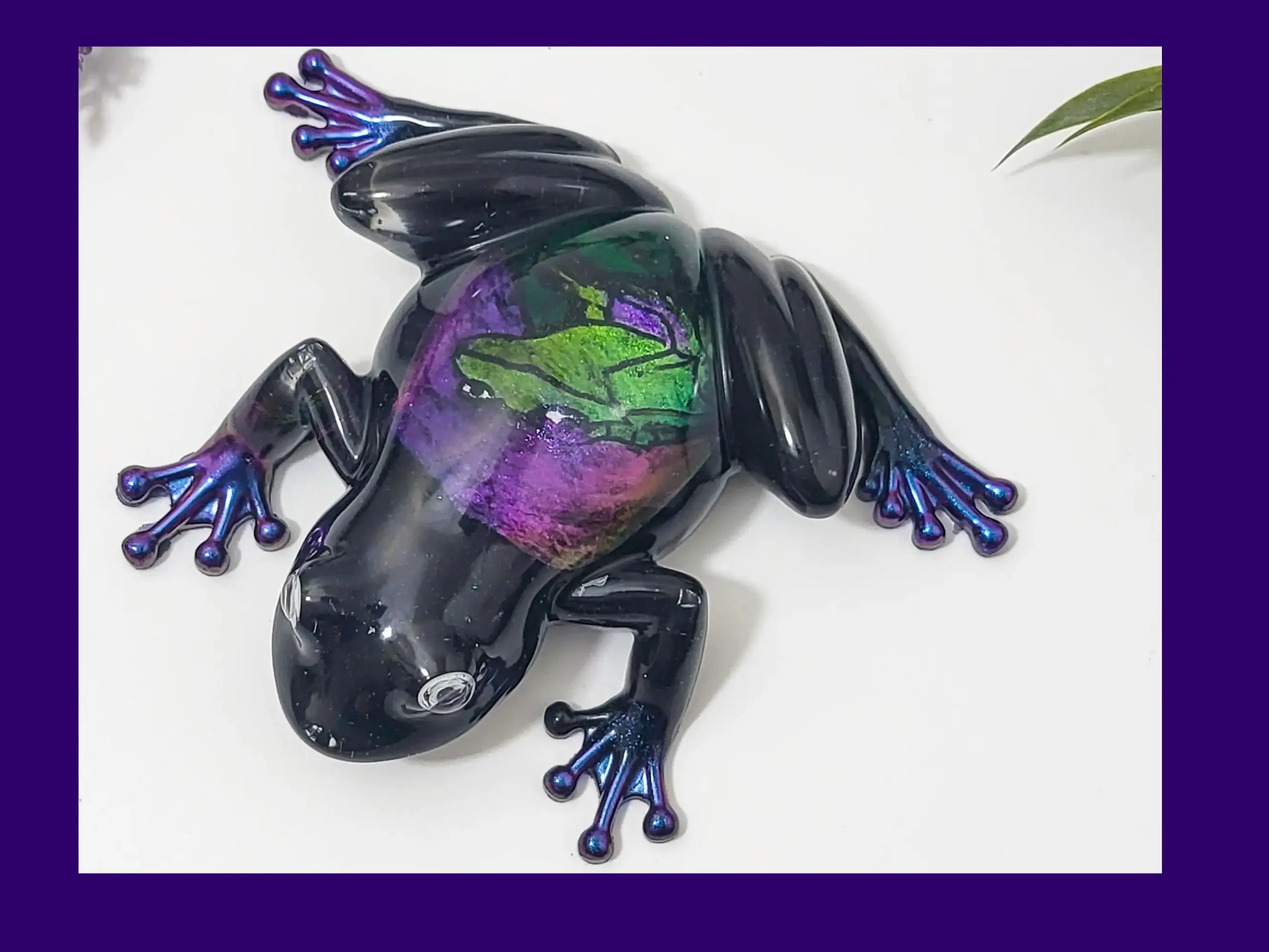 A shimmering black-and-purple resin frog with a stained-glass-style belly featuring a neon green silhouette. A bold, eye-catching piece that adds instant character to any room.