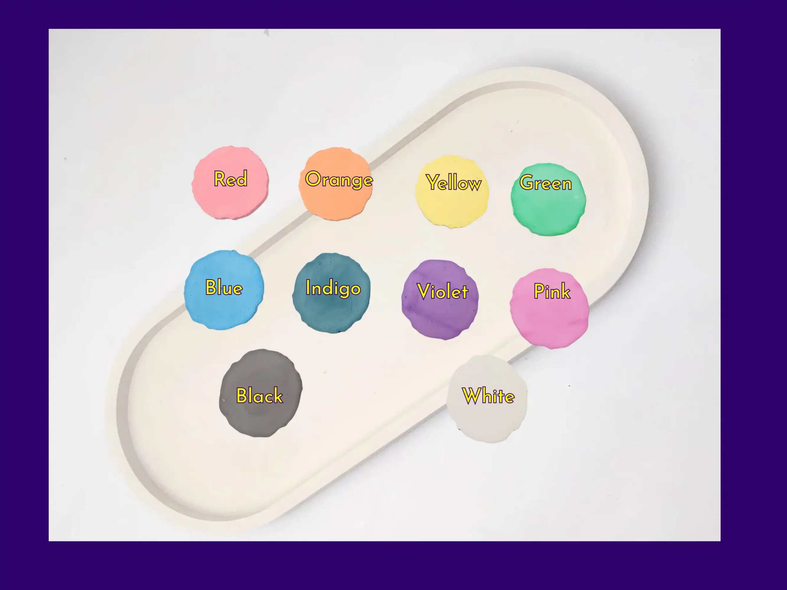 Red, Orange, Yellow, Green, Blue, Indigo, Violet, Pink, Black, White