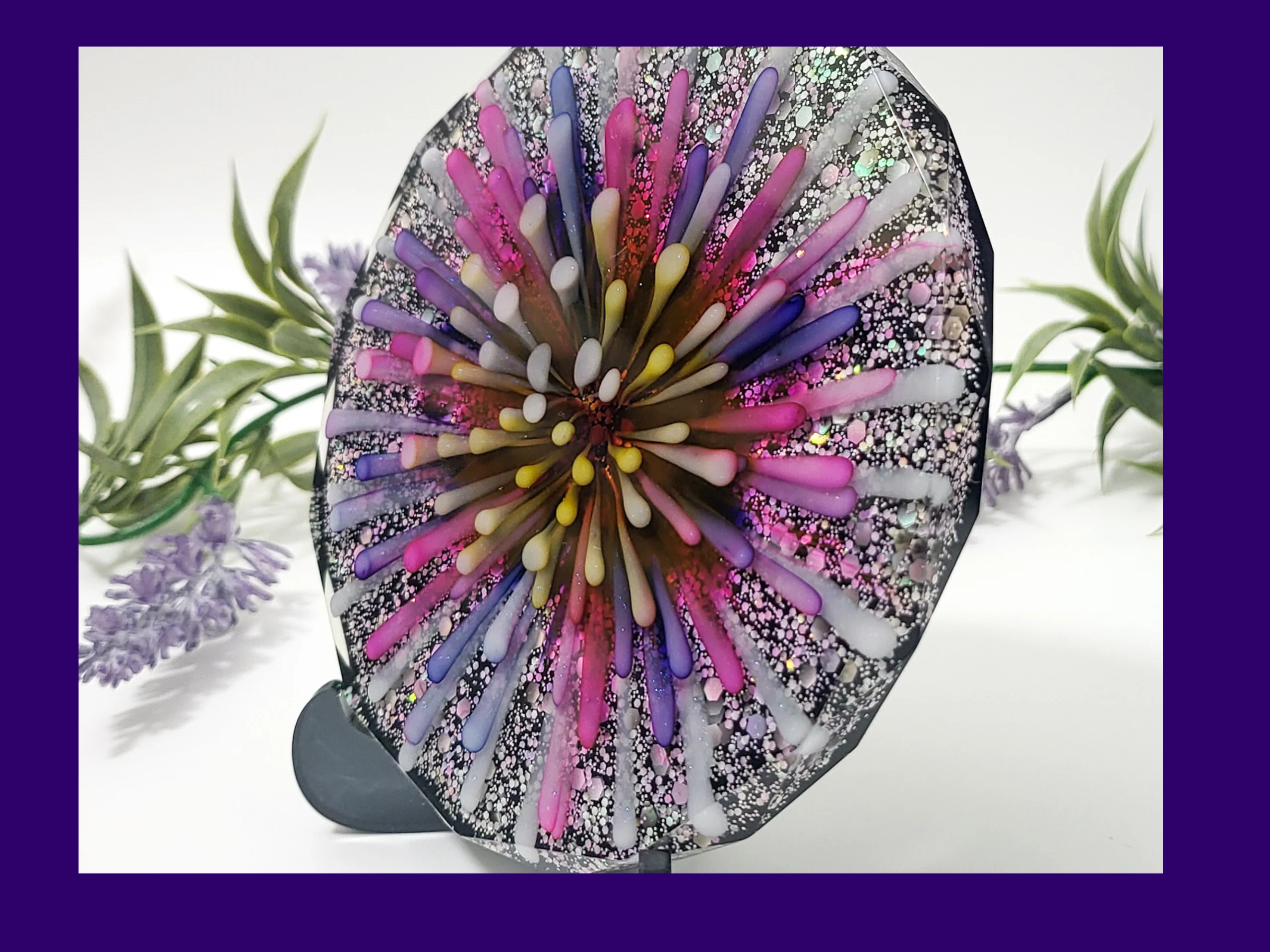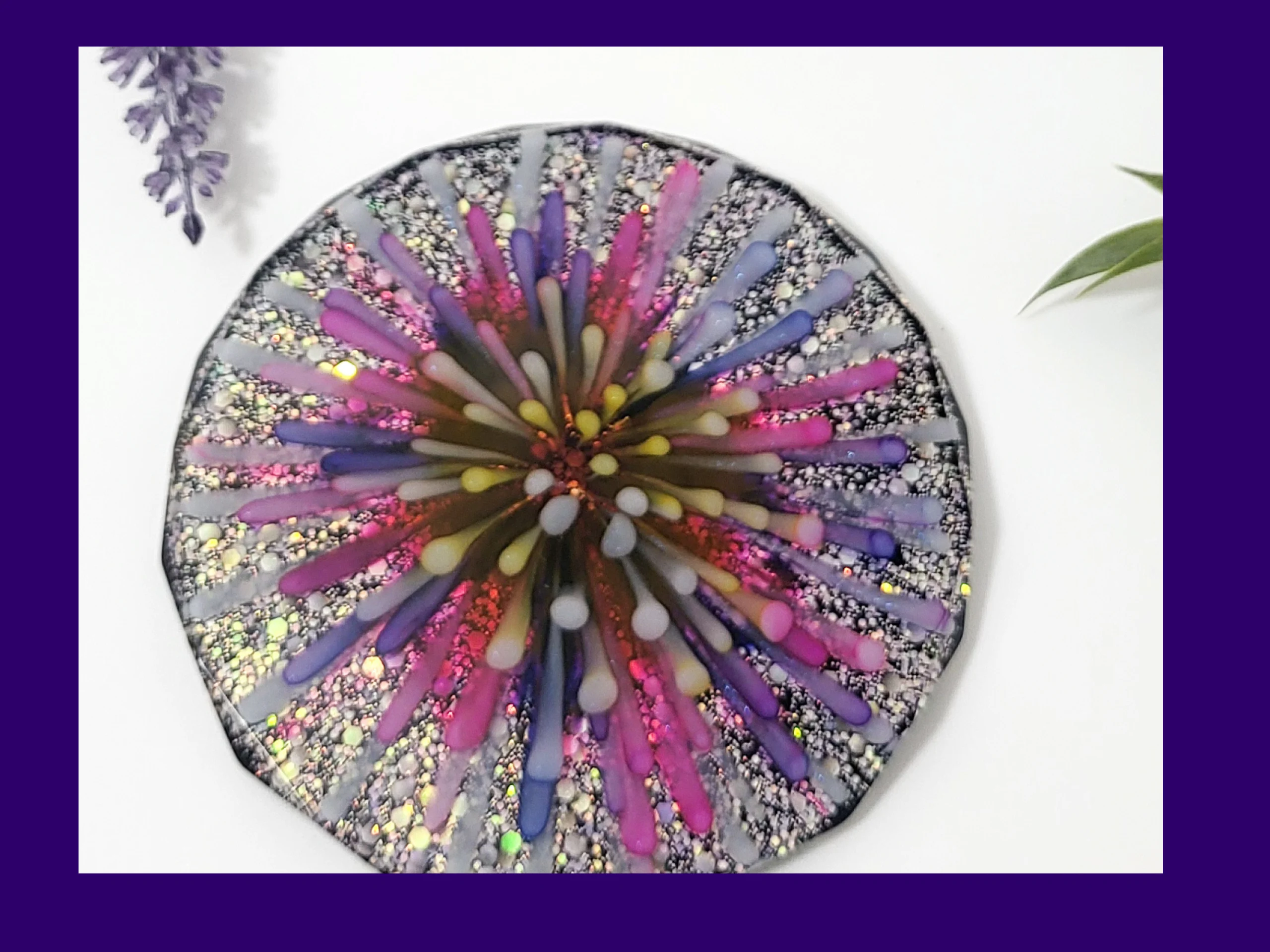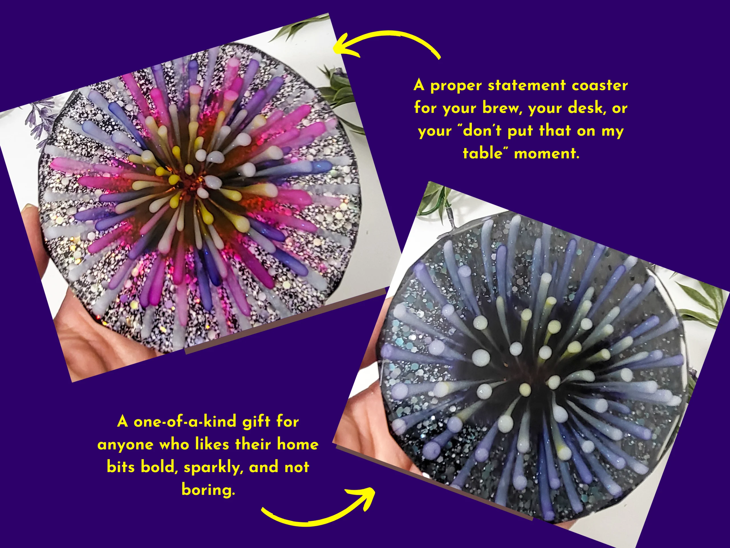 This Firework Bloom coaster is basically a tiny celebration in resin — a dark glittery base with a burst of purple, pink, and soft pops of yellow shooting out from the centre like a sparkler mid-meltdown.