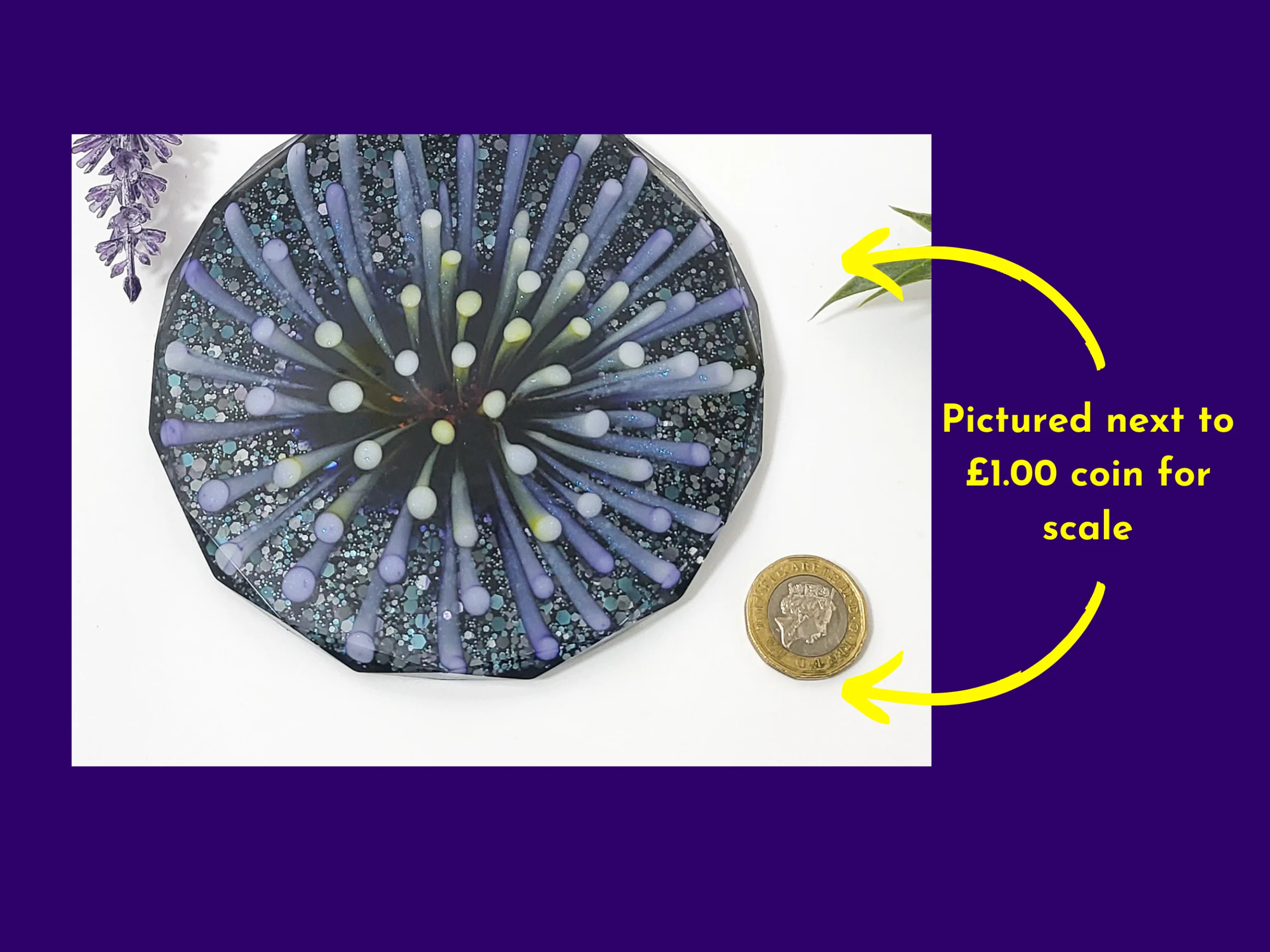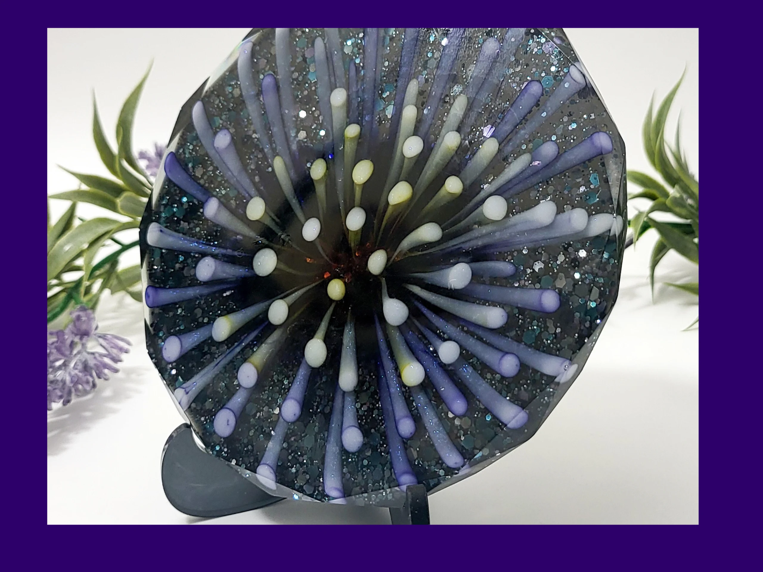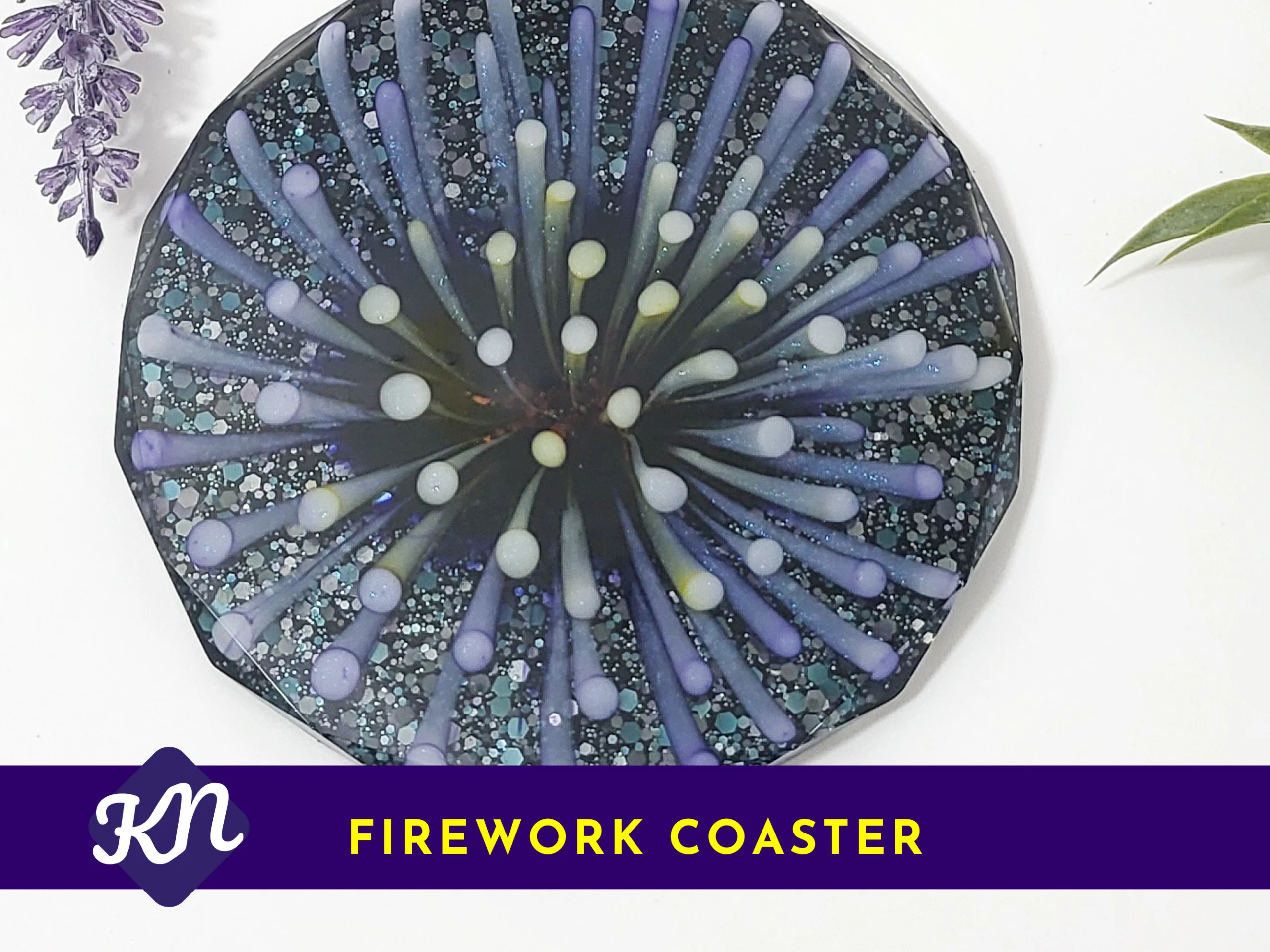 This Firework Bloom coaster is basically a tiny celebration in resin — a dark glittery base with a burst of purple, pink, and soft pops of yellow shooting out from the centre like a sparkler mid-meltdown.