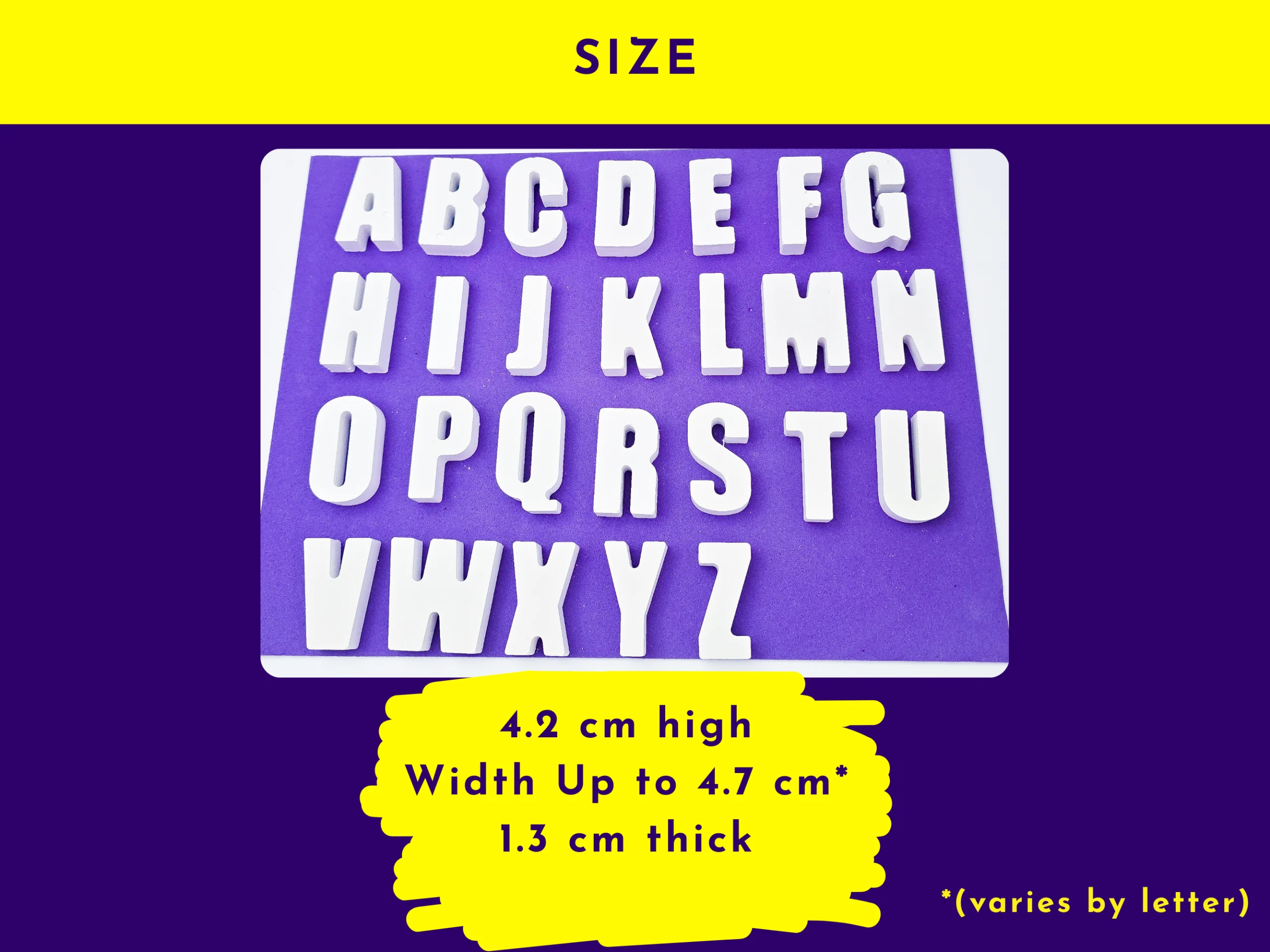 - Up to 4.7 cm wide (varies by letter)