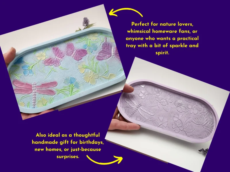 This pastel resin trinket tray features raised dragonfly and butterfly details with soft blues, pinks and yellows for a dreamy spring-inspired finish. Ideal for holding jewellery, keys, crystals or tea lights, it’s a sweet handmade décor piece for anyone who loves gentle colour and delicate detail.