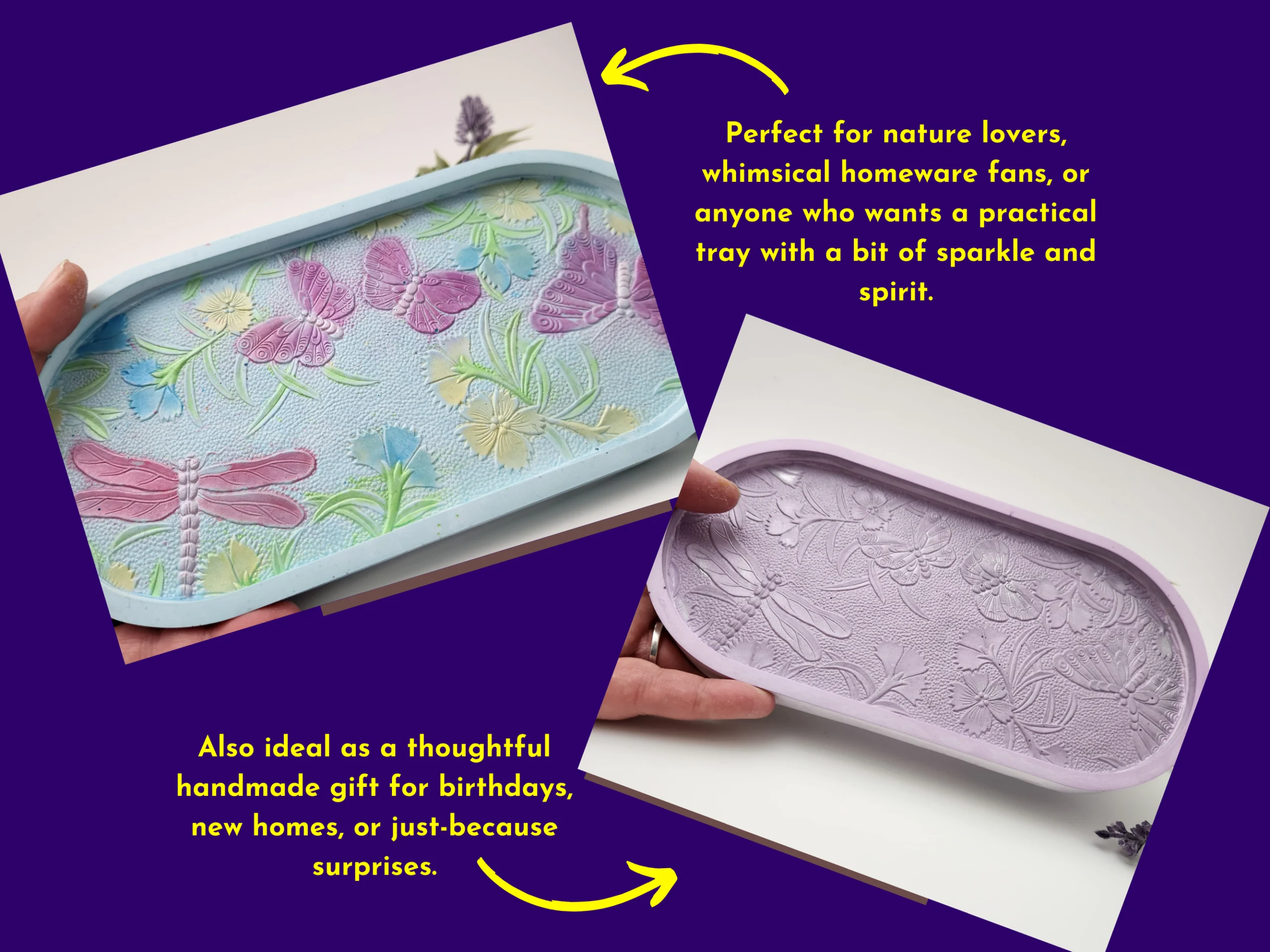A soft pastel resin trinket tray featuring raised dragonfly and butterfly details, finished in dreamy blues, pinks and yellows. Perfect for jewellery, keys, crystals, tea lights, or adding a gentle pop of colour to any space.