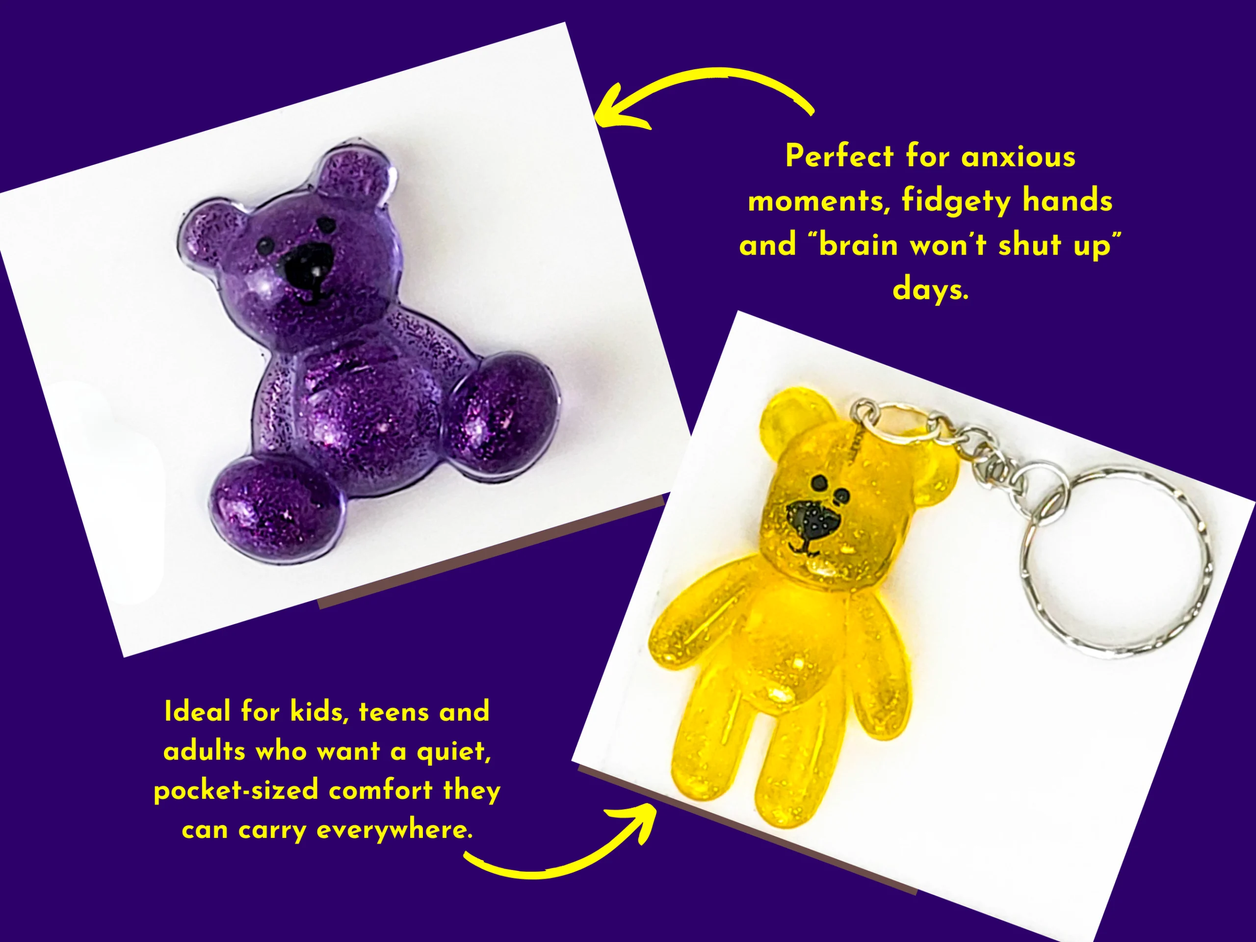 Meet the Worry Bears – tiny, glittery sidekicks for big feelings. When life feels a bit loud, these pocket-sized resin bears give fidgety hands something calm and familiar to hold. Keep one in a pocket or pencil case, or choose the keyring style for on-the-go backup on bags, lanyards and keys. Whisper your worries, rub their smooth surface, or just let them sit quietly in your palm – they don’t judge, they just listen.